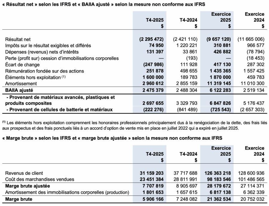 • Une perte au titre du BAIIA ajusté(2) de 222 276 $ au T4-2025 comparativement à 841 489 $ au T4-2024 pour le secteur des cellules de batterie et matériaux;
