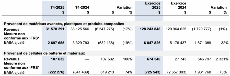• Un BAIIA ajusté(2) de 2 697 655 $ au T4-2025 comparativement à 3 329 793 $ au T4-2024 pour le secteur des matériaux avancés, plastiques et produits composites;