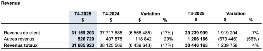 • Des revenus totaux de 31 685 923 $ pour le T4-2025 comparativement à 38 125 566 $ pour le T4-2024, ce qui représente une diminution de 17%;