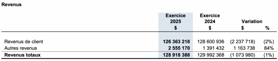 • Des revenus totaux de 128 918 388 $ pour l’exercice 2025 comparativement à 129 992 368 $ pour l’exercice 2024, ce qui représente une diminution de 1%;