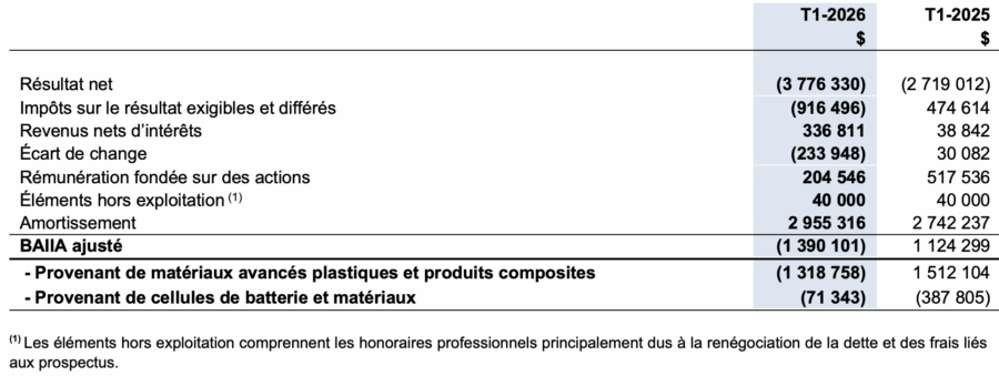 - Une perte au titre de BAIIA ajusté(2) de 71 343 $ comparativement à 387 805 $ pour la période précédente, pour le secteur des cellules de batterie et matériaux;