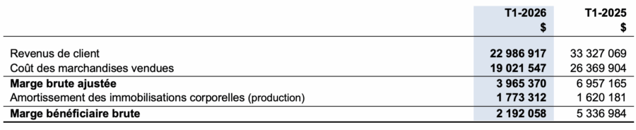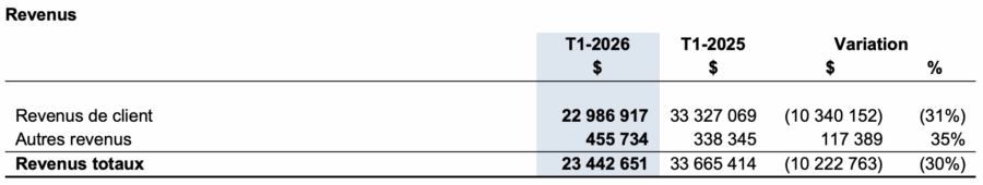 Les revenus de client sont passés de 33 327 069 $ au T1-2025 à 22 986 917 $ au T1-2026. La diminution s’explique principalement par la baisse du volume et des revenus d’outillage.
